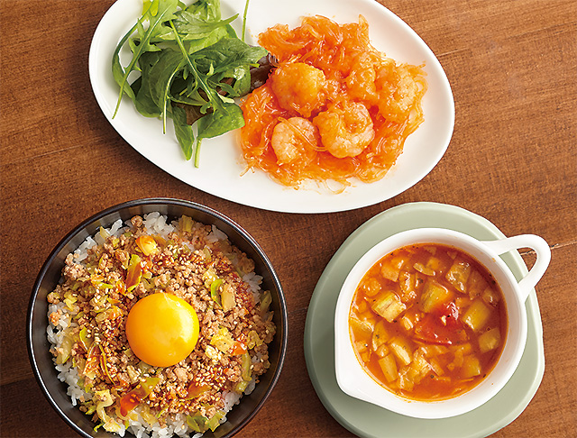 プチッとエビチリ麺、なすとトマトのスープ