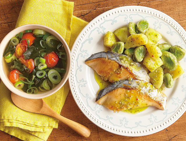 春のさわらとそら豆のバジルソテー
