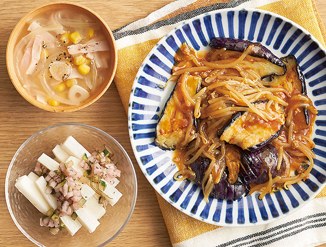 長いもたんざくゆかりの野菜ダレがけ、ハムとたまねぎの中華スープ