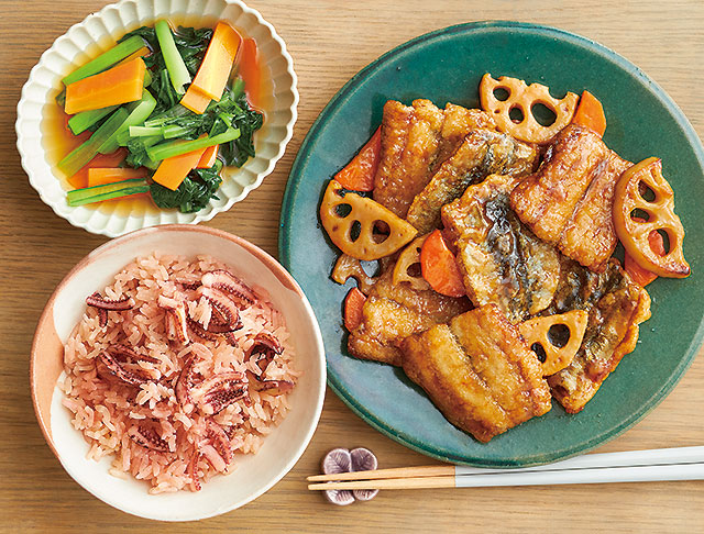 いかの炊き込みごはん、小松菜のおひたし