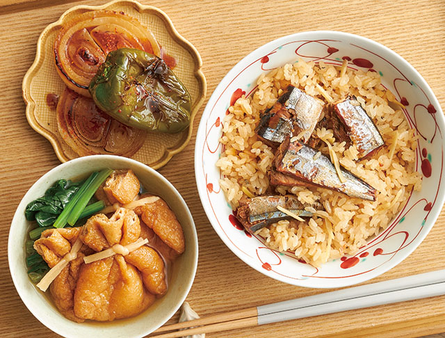 サブもち巾着と小松菜の煮付け、たまねぎと丸ごとピーマン焼き