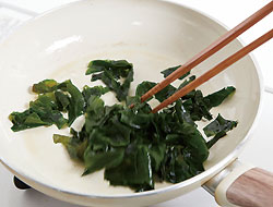 (1)カットわかめを包材通りに戻し、水気をしっかり絞る。(2)深さのあるフライパン(鍋でも可)にごま油を熱し(1)を炒めて水、中華スープの素を入れ、ふたをして沸騰したら弱火で3分煮込む。