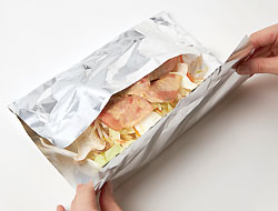 野菜を下にして鮭をのせて包んでください。(3)(2)をフライパンに並べふたをし、中火で4分後、弱火で8分加熱してできあがり。