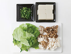 (1)とうふは6等分に、きのこは根元を落とし小房に分ける。レタスは大きめにちぎり、青ねぎは小口切りにする。