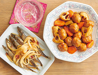 鶏だんごとれんこんの炒めもの、ししゃもの中華マリネ