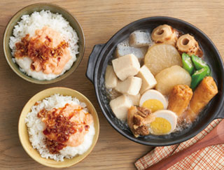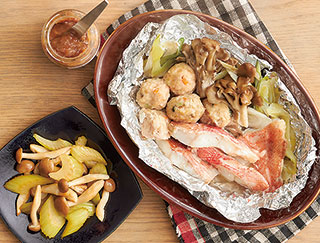材料:骨とり赤魚切身、もち入り鶏だんご、白ねぎ、まいたけ、梅おかか、酒、水、セロリ漬、ぶなしめじ、ごま油、しょうゆ
