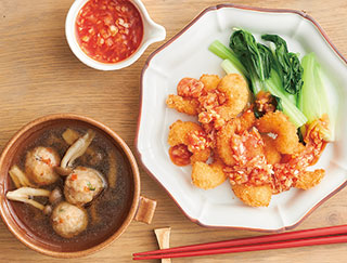 辛くないチリ風ソースのエビフライ、鶏だんごの中華スープ