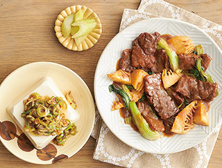 牛肉と絹厚揚げの煮物、さつまいものサラダ