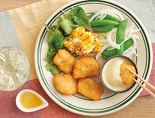 白身魚フライとチーズソース、さっぱりドレッシングのサラダ