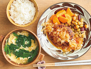 和風たまねぎソースハンバーグ、ほうれん草と卵のコンソメスープ