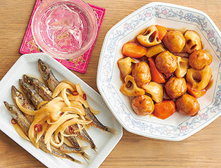 鶏だんごとれんこんの炒めもの、ししゃもの中華マリネ