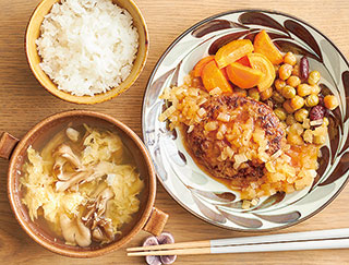 和風たまねぎソースハンバーグ、まいたけと卵のコンソメスープ