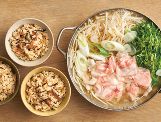 材料:豚バラ切落し、豆苗、もやし、白ねぎ、にんにく、豚しゃぶ野菜鍋つゆ、炊き込みご飯の素、米