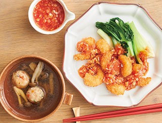 辛くないチリ風ソースのエビフライ、鶏だんごの中華スープ