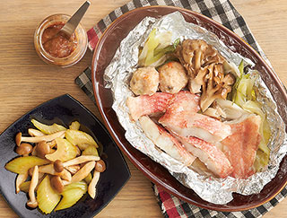 材料:骨とり赤魚切身、もち入り鶏だんご、白ねぎ、まいたけ、梅おかか、酒、水、セロリ漬、ぶなしめじ、ごま油、しょうゆ