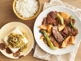 材料:牛モモうす切、絹厚揚げ、白ねぎ、しょうゆ