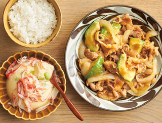 材料:豚しょうが焼き(たれ漬け)、アボカド、たまねぎ、サラダ油、あんかけ玉子とうふ、サラダフレーク