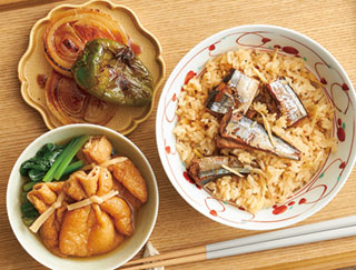 さんまと生姜の炊き込みごはん、もち巾着と小松菜の煮付け、たまねぎと丸ごとピーマン焼き