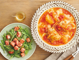 つくりおきチーズがとろりロールキャベツ、水菜とベーコンのサラダ