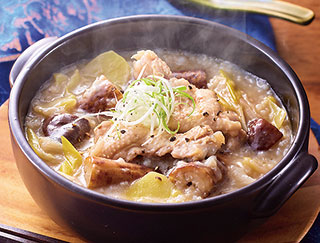 材料:手羽元、ごぼう、白ねぎ、生しいたけ、にんにく、生姜、米、塩、ごま油、白髪ねぎ・粗びき黒こしょう
