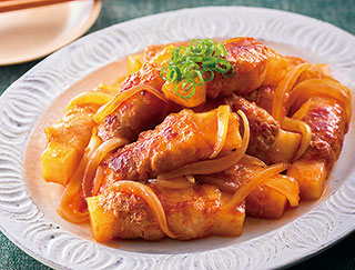 材料:豚バラうす切、切り餅、玉ねぎ、小麦粉、油、青ねぎ(小口切)