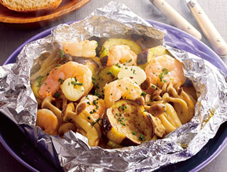 材料:むきえび、なす、しめじ、にんにく、塩、オリーブ油、パセリみじん切(あれば)
