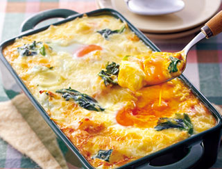 材料:絹とうふ、ハーフベーコン、玉ねぎ、冷凍ほうれん草、卵、ピザ用チーズ、バター、小麦粉