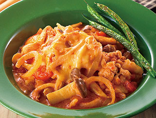 材料:豚ロースしゃぶしゃぶ用、ホールトマト、玉ねぎ、しめじ、エリンギ、ピザ用チーズ