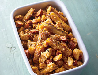 材料:ポークウインナー、じゃがいも、水菜、しめじ、削り節、油