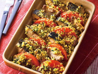 洋食さばとしいたけ、トマトのパン粉焼き