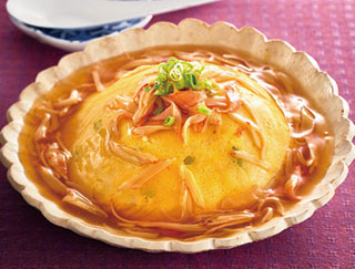 材料:絹とうふ、ほぼカニ、卵、冷凍枝豆のむき実、片栗粉、青ねぎ(小口切)