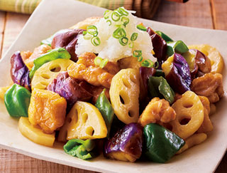 材料:鶏モモ切身(小さめ)、れんこん、なす、ピーマン、油、片栗粉、塩、大根おろし・青ねぎ(小口切)