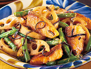 材料:秋鮭の便利カット、れんこん、冷凍いんげん、油、片栗粉