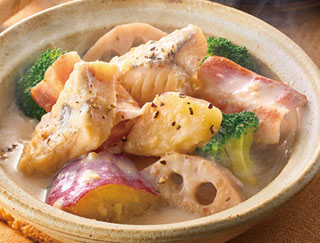 材料:真たら切身、ハーフベーコン、さつまいも、れんこん、ブロッコリー、無調整豆乳、ごま油、塩・こしょう、小麦粉・粗びき黒こしょう