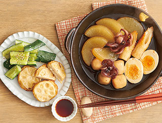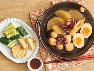 材料:たこと里芋の煮付(たれ付き)、大根、ちくわ、卵、水、からし