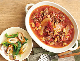 おまかせ献立(3人分)牛肉のトマトシチュー、ピーマンとちくわのコンソメ炒め