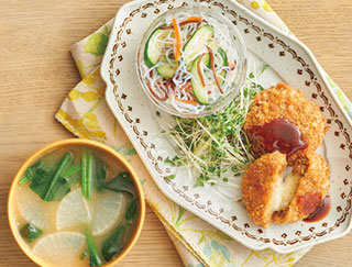 おまかせ献立(2人分)チーズミンチカツ、ほうれん草と大根のみそ汁、きゅうりの酢の物ベース