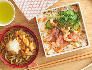 材料:五目ちらしの素(のりごま付)、彩り海鮮丼の具、スプラウト、きゅうり、ご飯、塩、茶そば(つゆ付)、大根、ごぼうちぎり、a)茶そば添付のつゆ、水