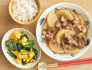 おまかせ献立(3人分)牛肉と大根のコクうま煮込み、ほうれん草とたまごのごま油炒め