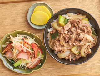 おまかせ献立(2人分)牛丼、焼豚ともやしの中華炒め