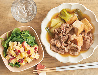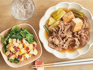 牛肉と絹厚揚げの煮物、さつまいものサラダ