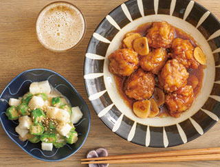 材料:豚こまぎれ、きゅうり、白ねぎ(みじん切)、油、片栗粉・レモンのいちょう切(あれば)
