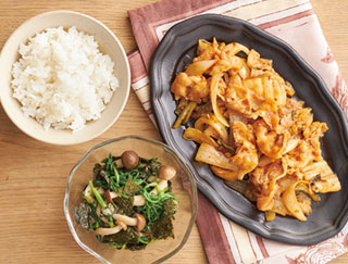 おまかせ献立(3人分)豚キムチ、菊菜としめじののりナムル