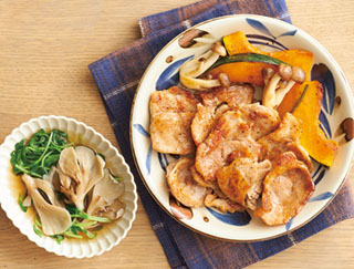 材料:豚ヒレ焼きチーズ風味、南瓜、ぶなしめじ、サラダ油、塩・こしょう、豆苗、まいたけ、a)水、酒、みりん、しょうゆ・砂糖、和風だしの素、塩