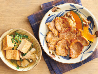 材料:豚ヒレ焼きチーズ風味、南瓜、ぶなしめじ、サラダ油、塩・こしょう、豆苗、まいたけ、絹厚あげ、a)水、酒、みりん、しょうゆ・砂糖、和風だしの素、塩