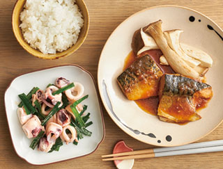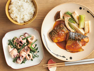 骨取りさばのみぞれ煮、いかとにらのやみつき炒め