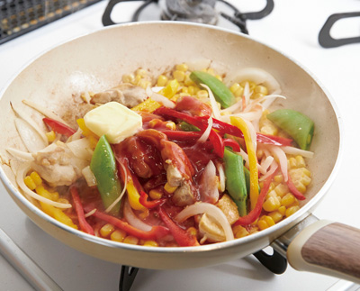 (1)鶏モモ肉切身は解凍する。(2)スパゲッティーは表示通りに茹でてザルにあげる。(3)とうもろこしは実を削ぎ、たまねぎは薄切り、カラーピーマンは細切り、スナップえんどうは筋を取り2等分に切る。(4)フライパンにサラダ油を熱し、(1)、(3)順に軽く炒め、を入れてふたをし火を通す。(2)を入れてからめ塩・胡椒で味を整える。軽く炒めて具材に油がまわったら味付けを