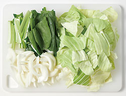 (1)Aは合わせておく。(2)たまねぎは幅6~7mmに、キャベツはざく切り、小松菜は長さ6cmほどに切っておく。