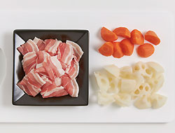 (1)豚うす切りバラはひと口サイズに、れんこん、人参は皮をむいて乱切りにする。