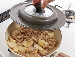ふたをして豚肉のうまみをじわじわとたけのこに染みわたらせます。
